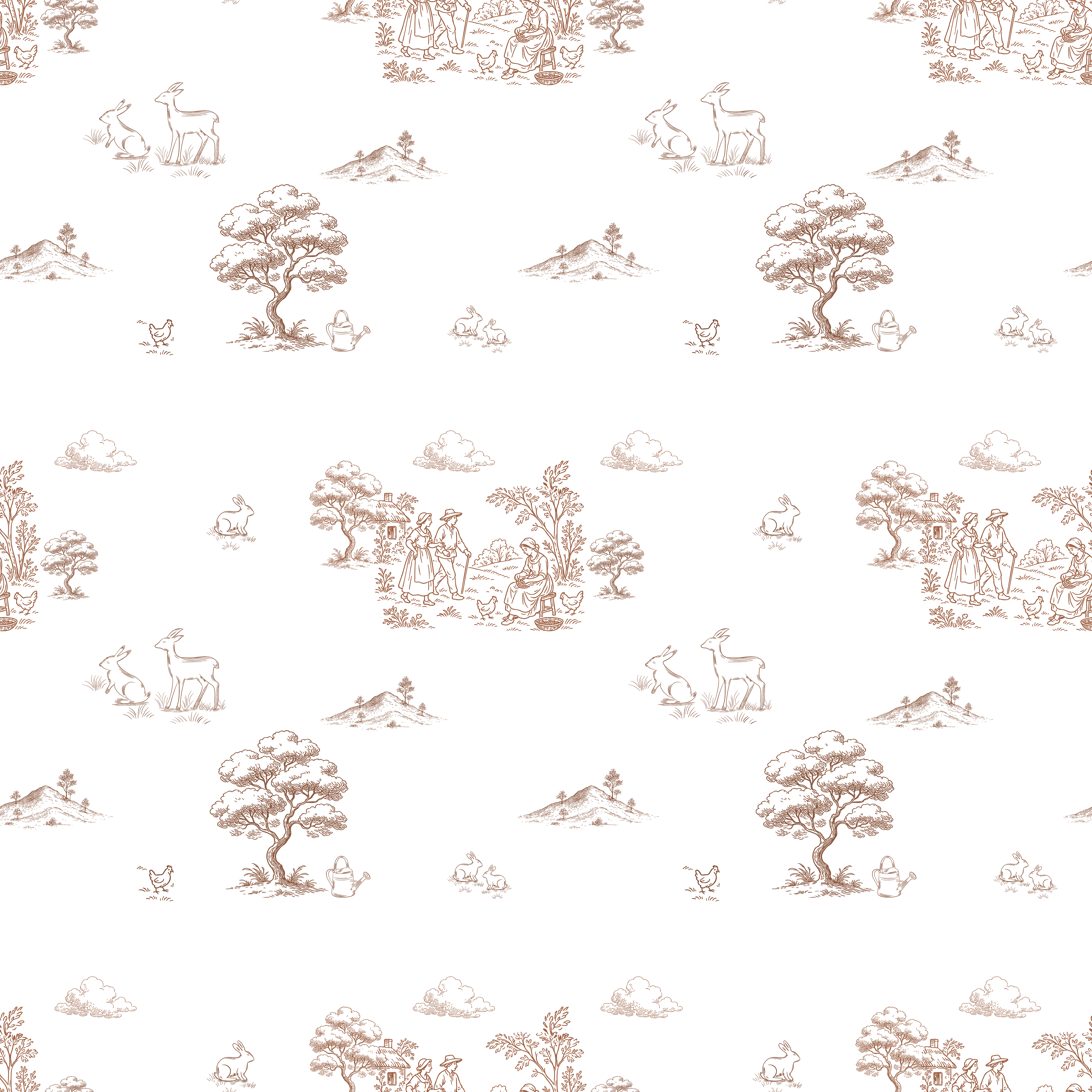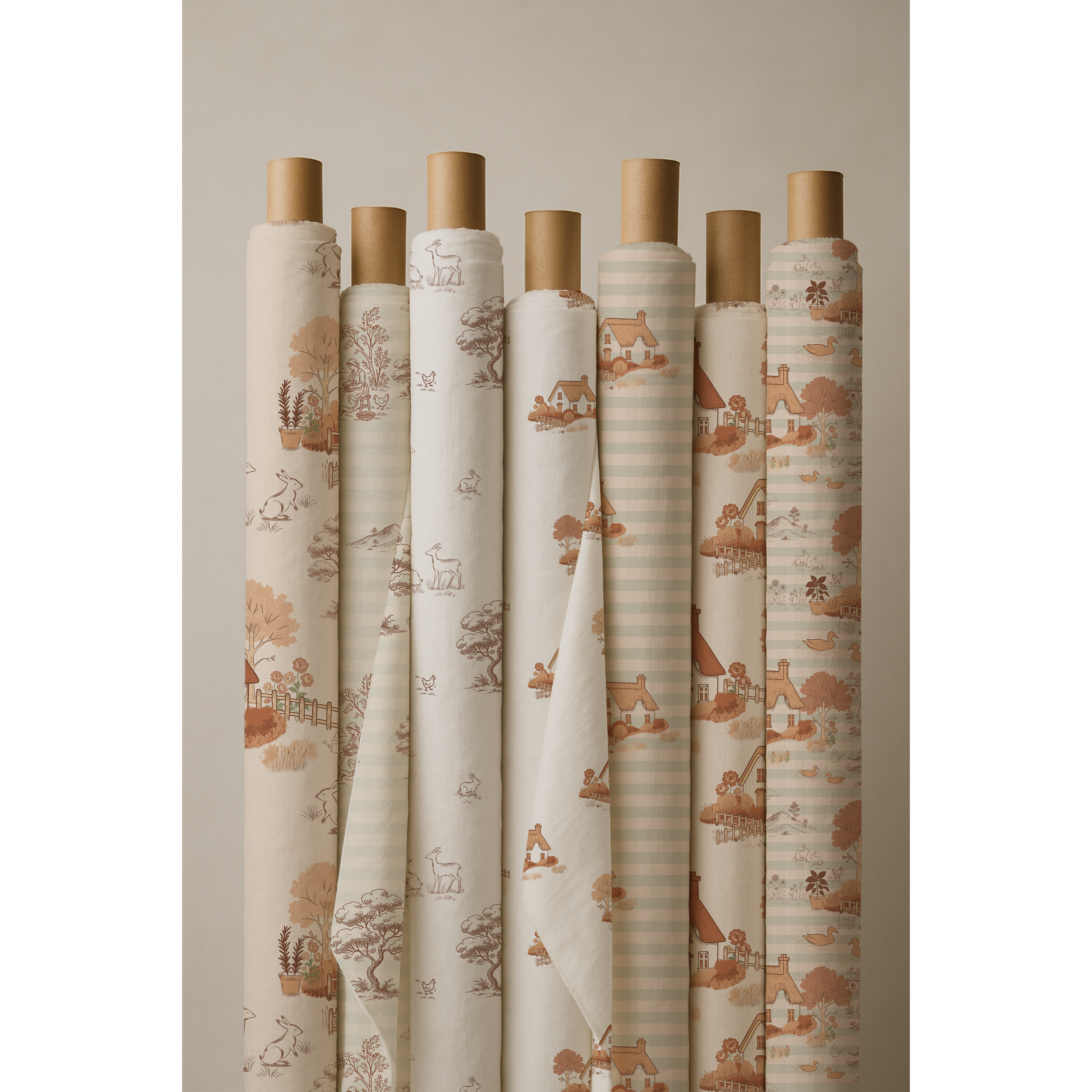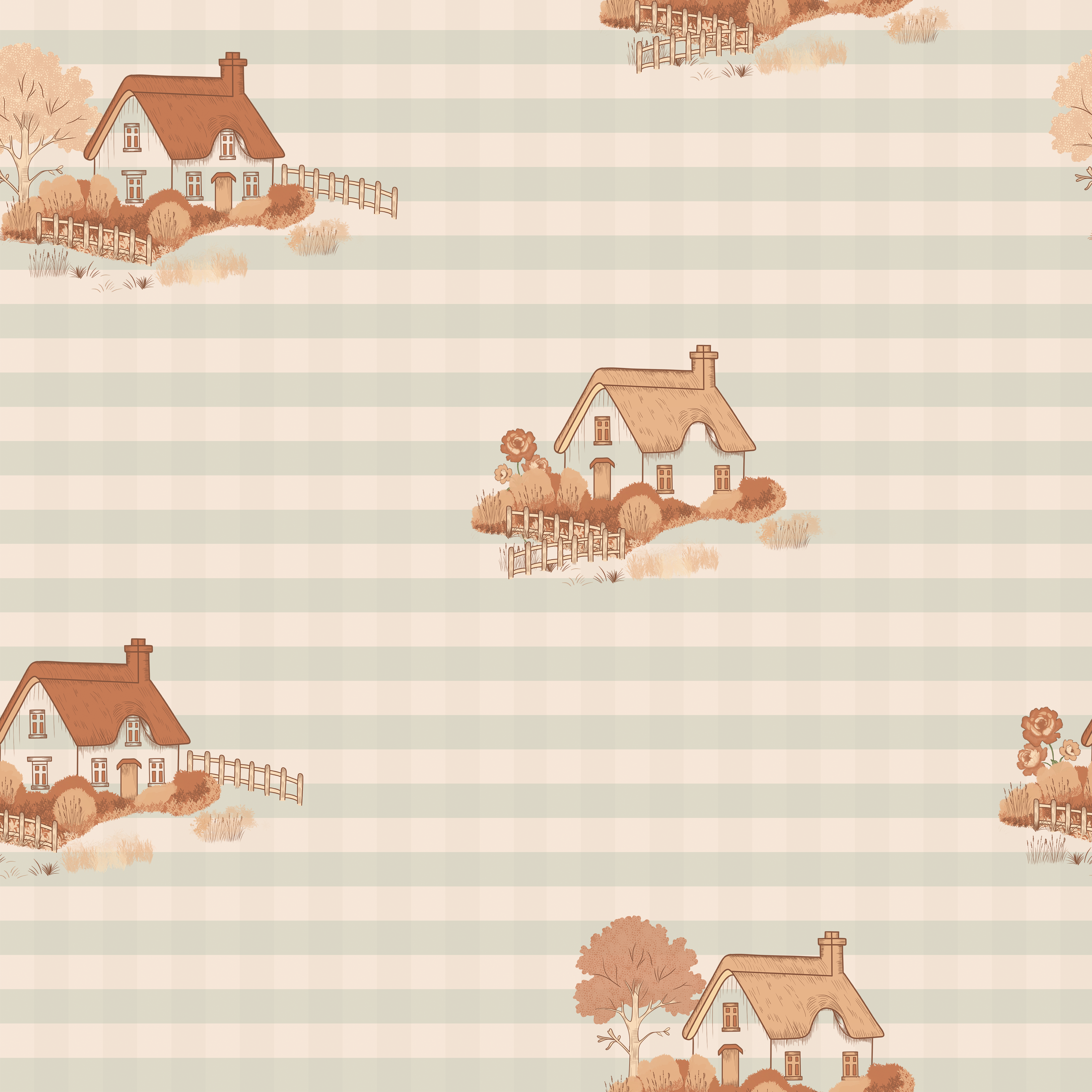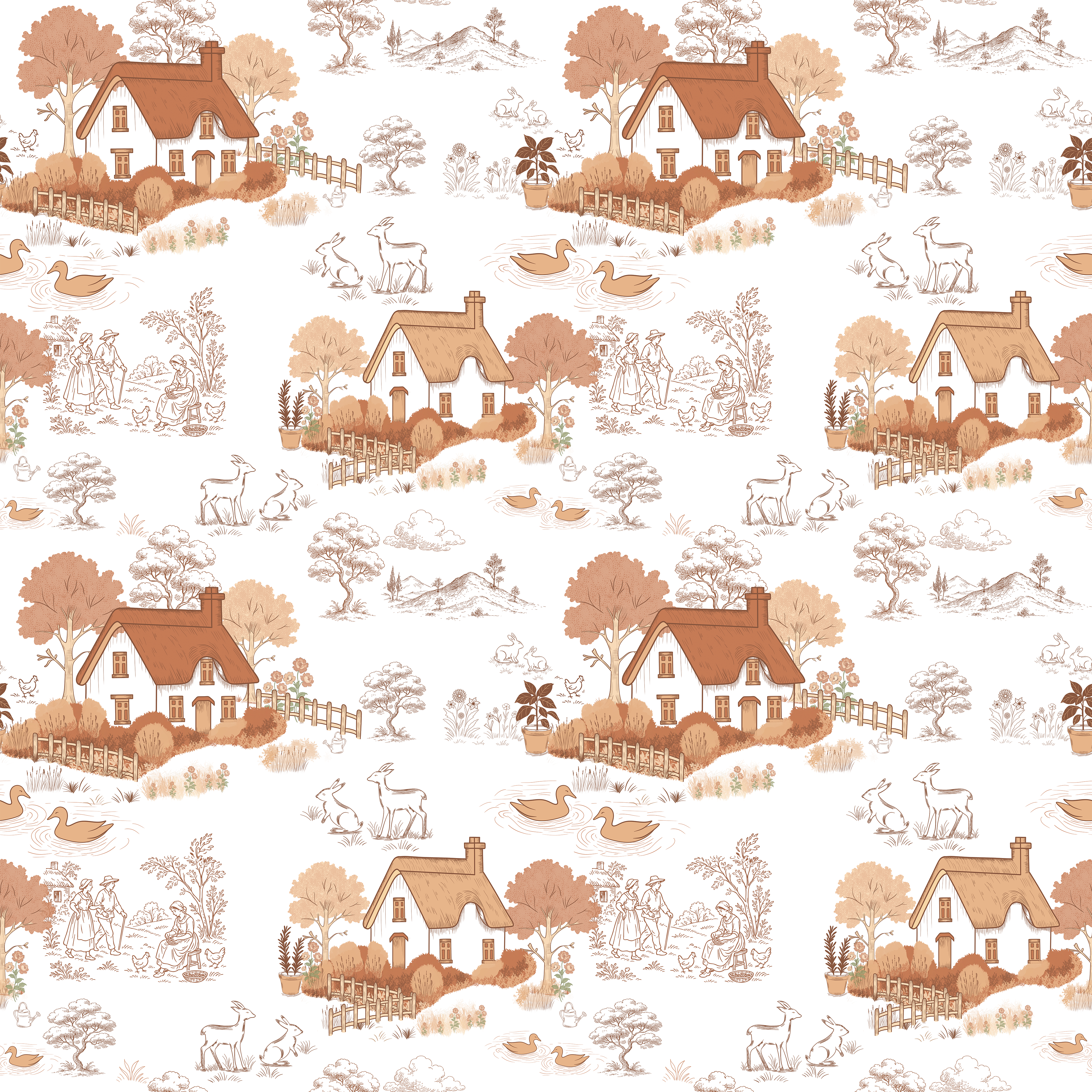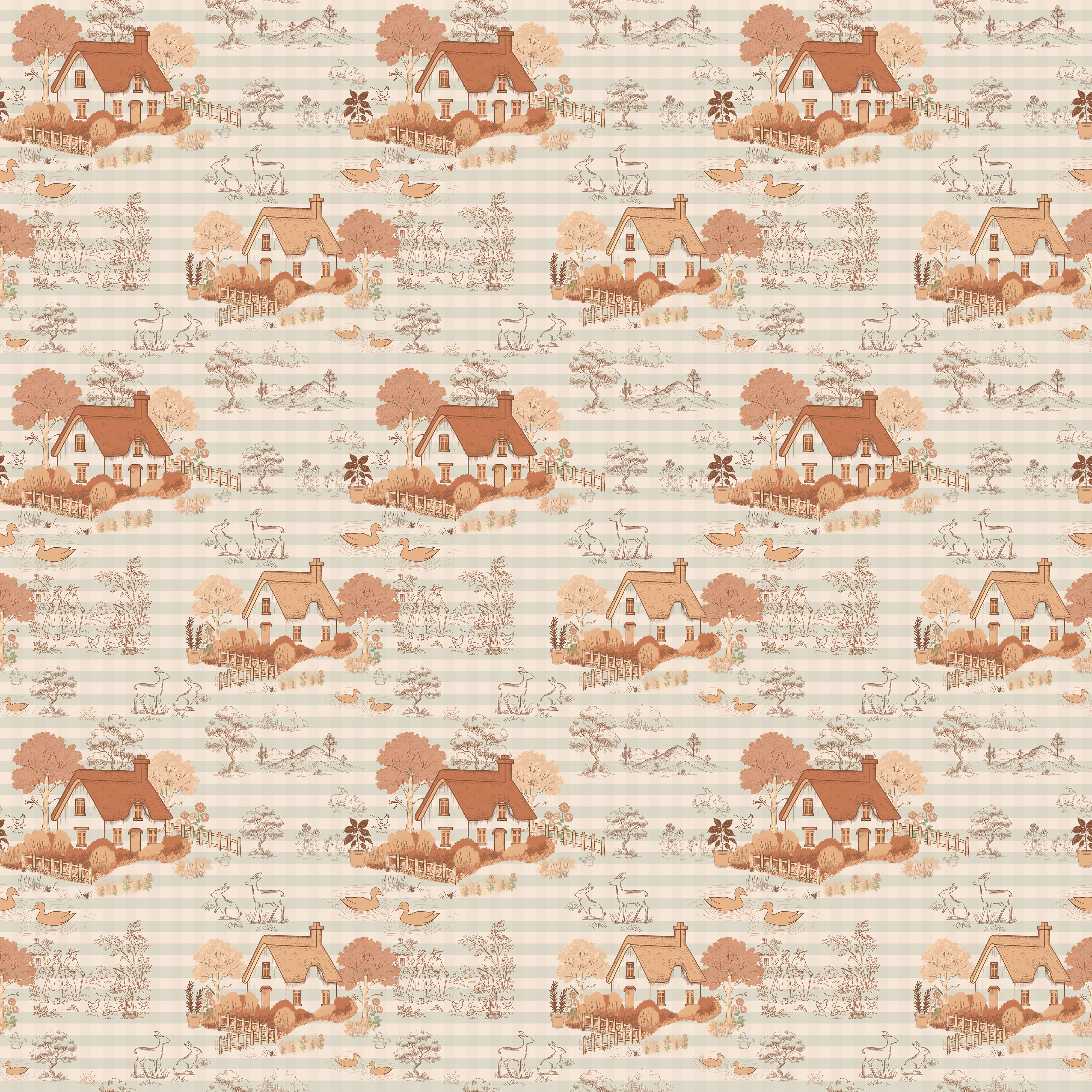 Whispers of the Countryside is a gentle ode to rural life, blending the cozy charm of cottagecore with classic toile-inspired storytelling. This collection paints a picture of peaceful villages, open fields, and quiet moments — where animals roam freely, gingham cloths flutter in the breeze, and time slows to a pastoral rhythm. Rendered in warm creams, soft sages, muted pinks, and earthy terracotta, the prints evoke comfort, nostalgia, and a return to simple beauty.