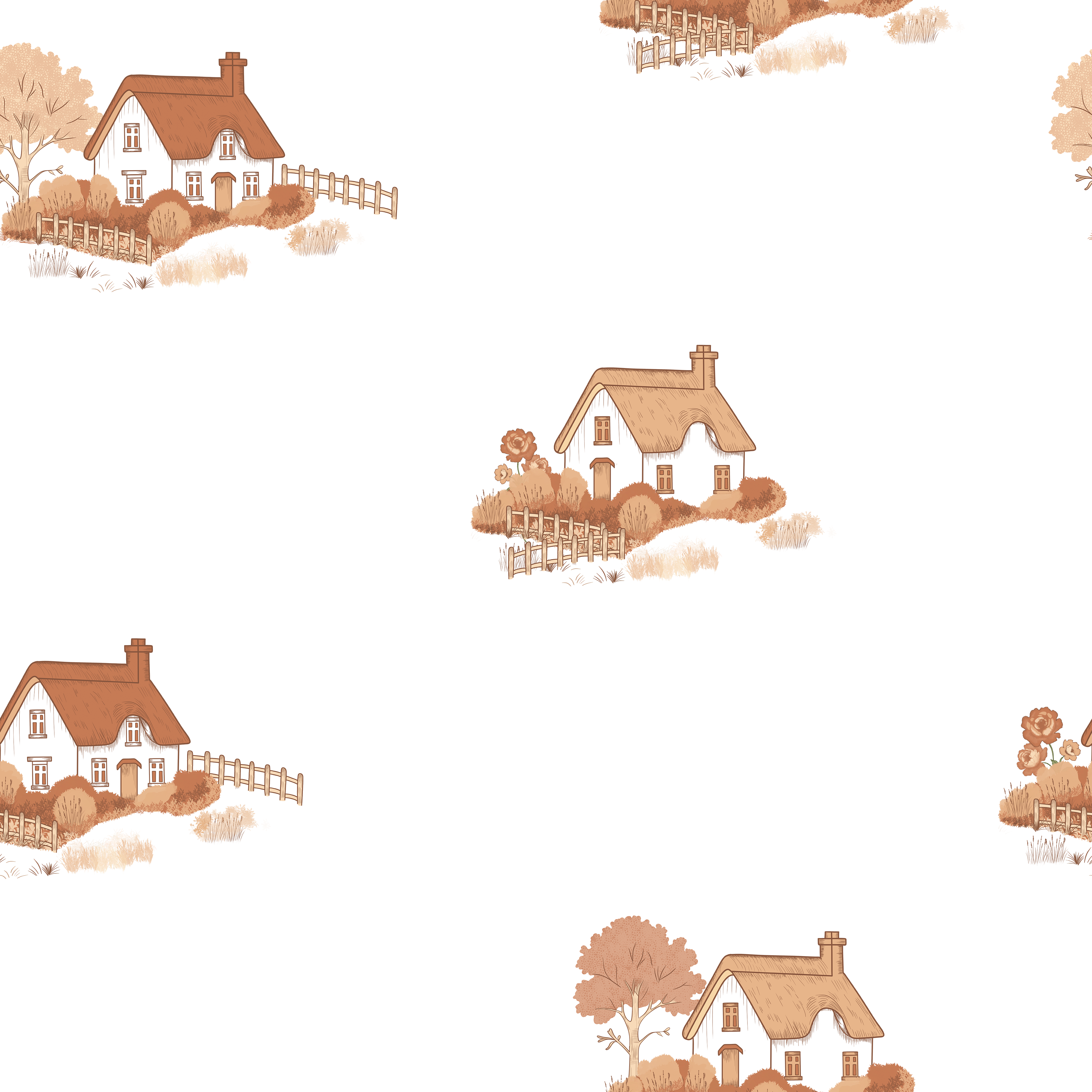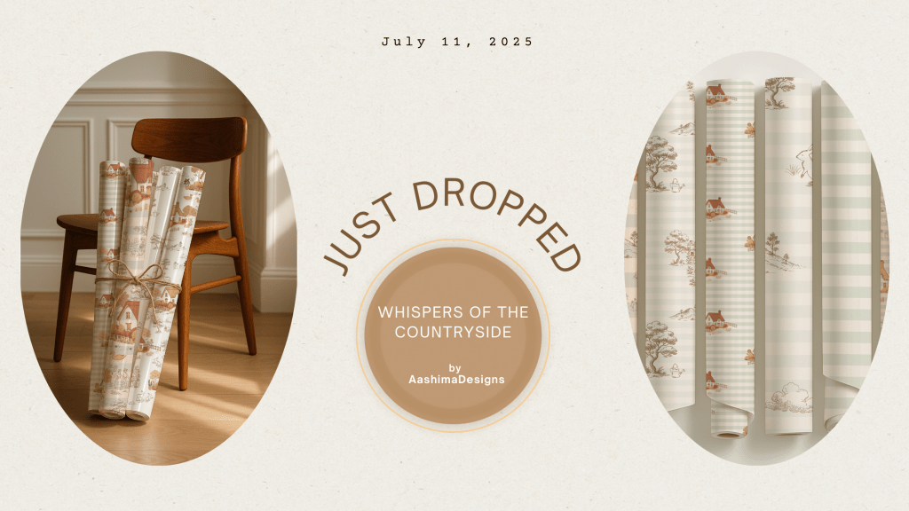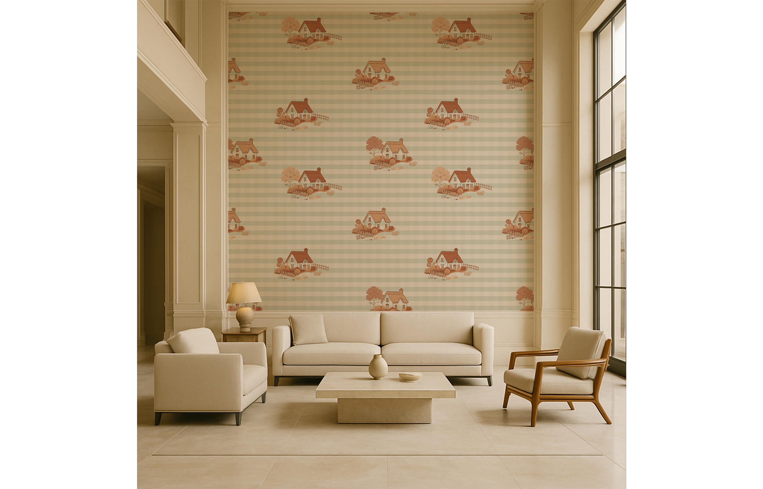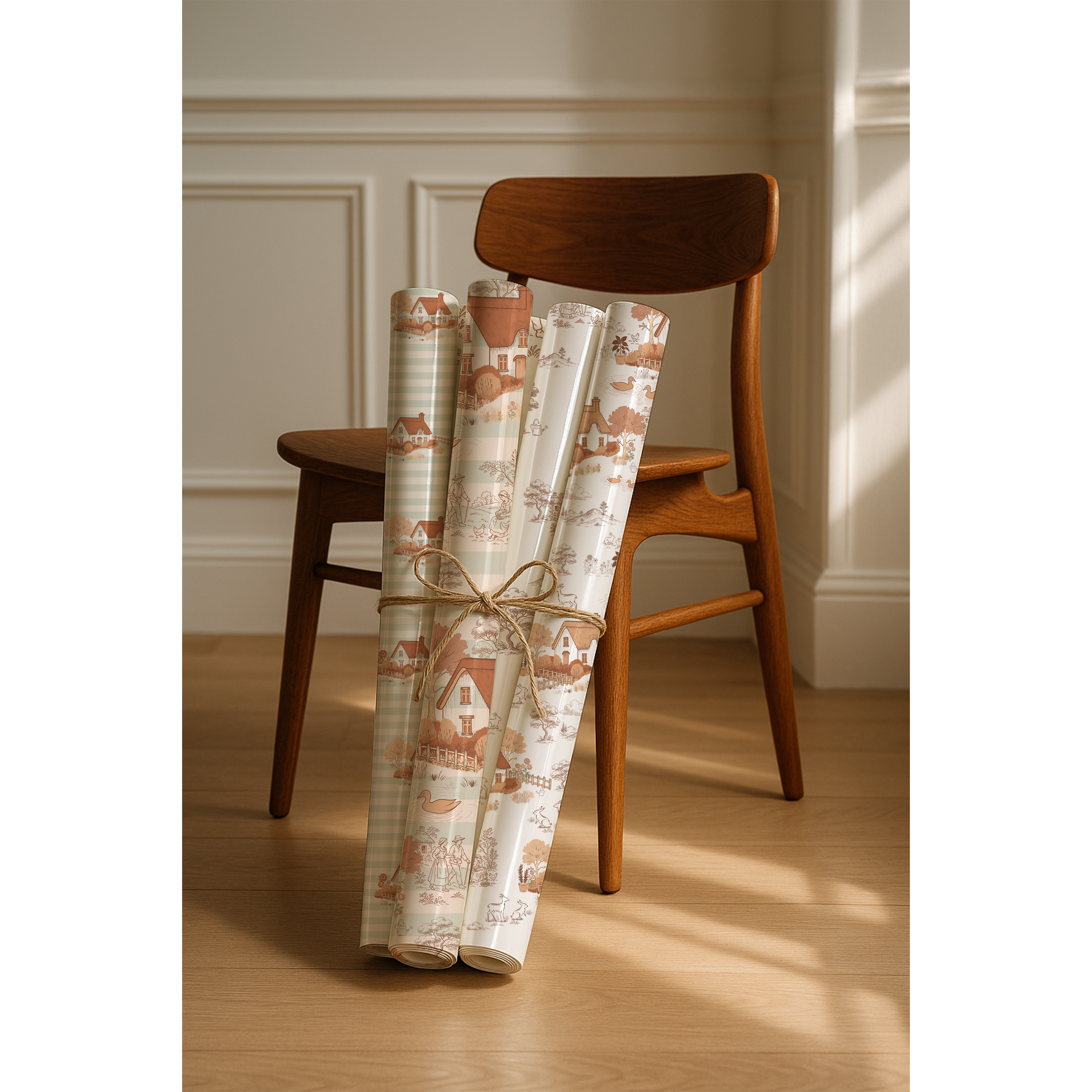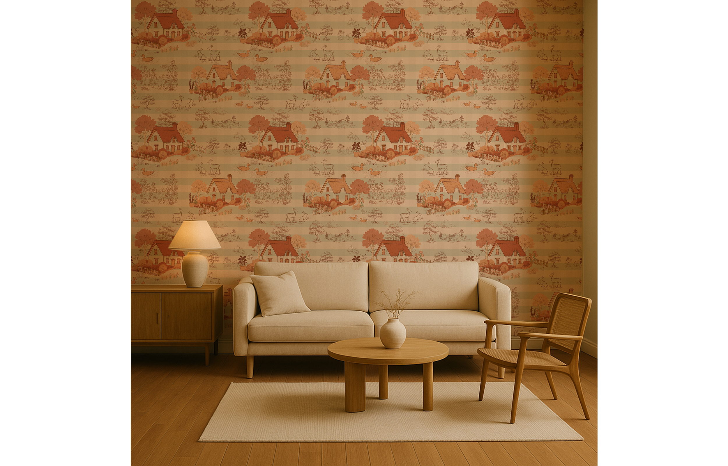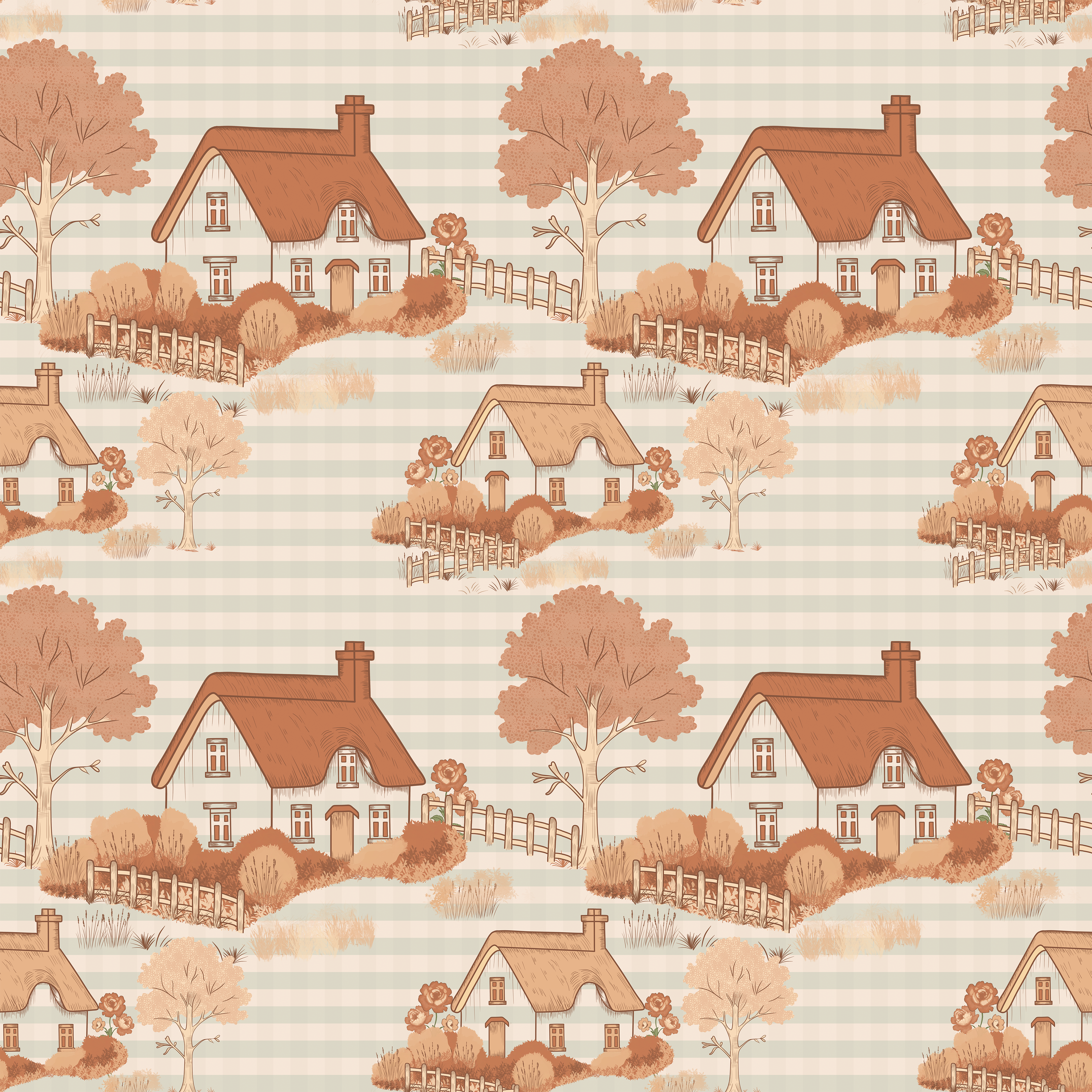 Whispers of the Countryside is a gentle ode to rural life, blending the cozy charm of cottagecore with classic toile-inspired storytelling. This collection paints a picture of peaceful villages, open fields, and quiet moments — where animals roam freely, gingham cloths flutter in the breeze, and time slows to a pastoral rhythm. Rendered in warm creams, soft sages, muted pinks, and earthy terracotta, the prints evoke comfort, nostalgia, and a return to simple beauty.