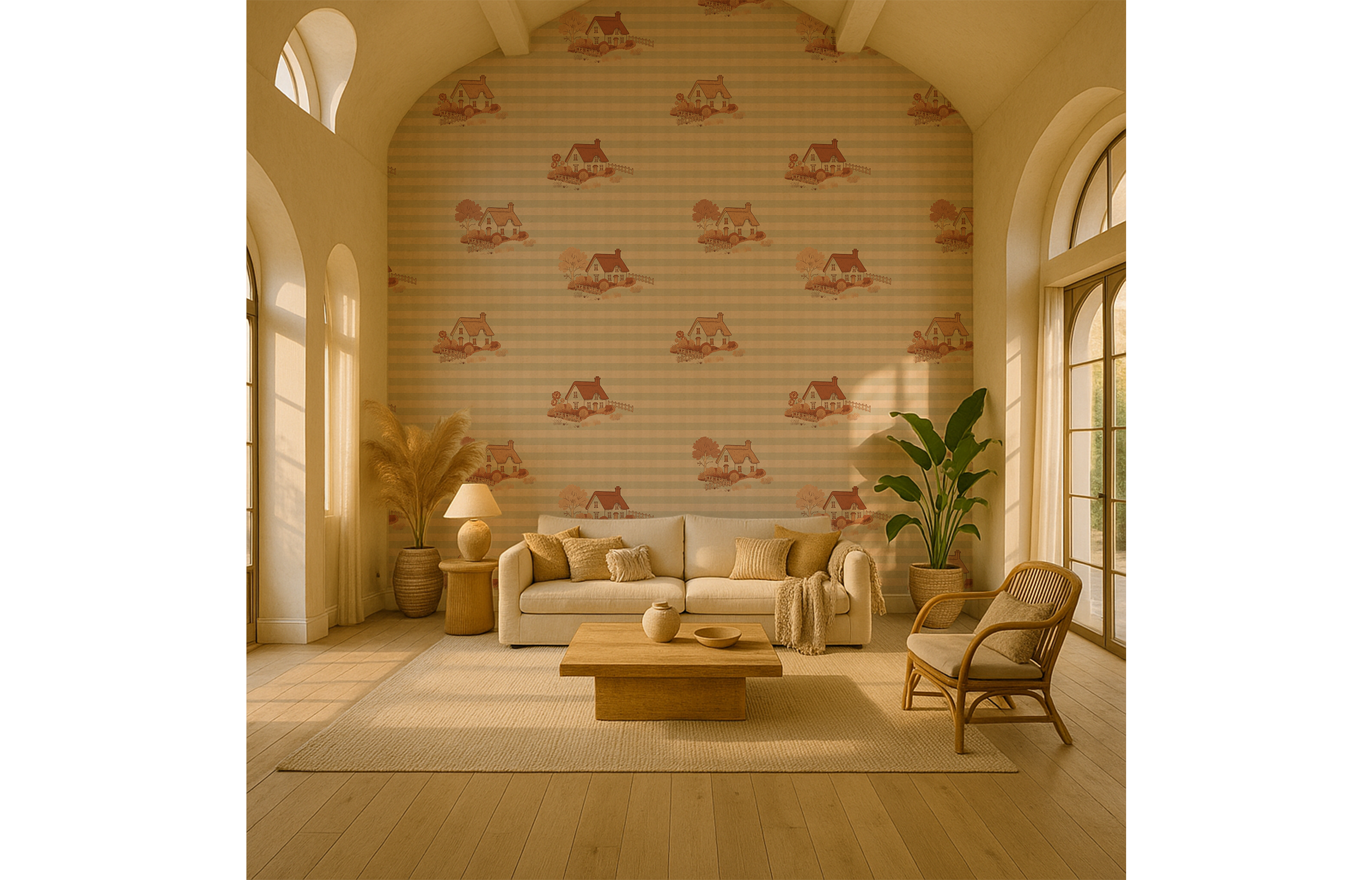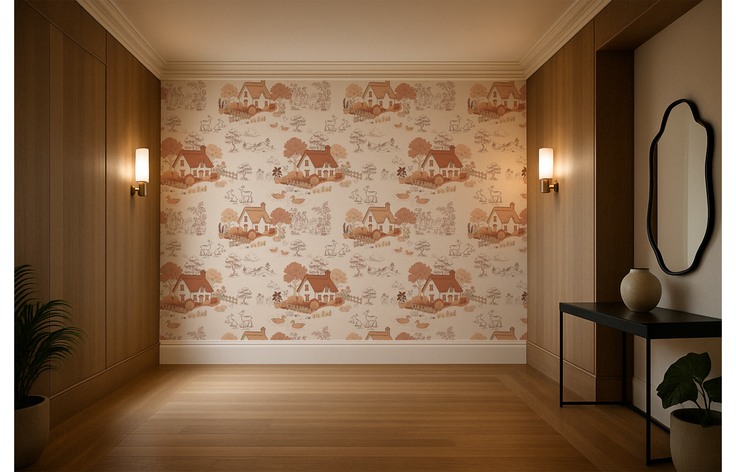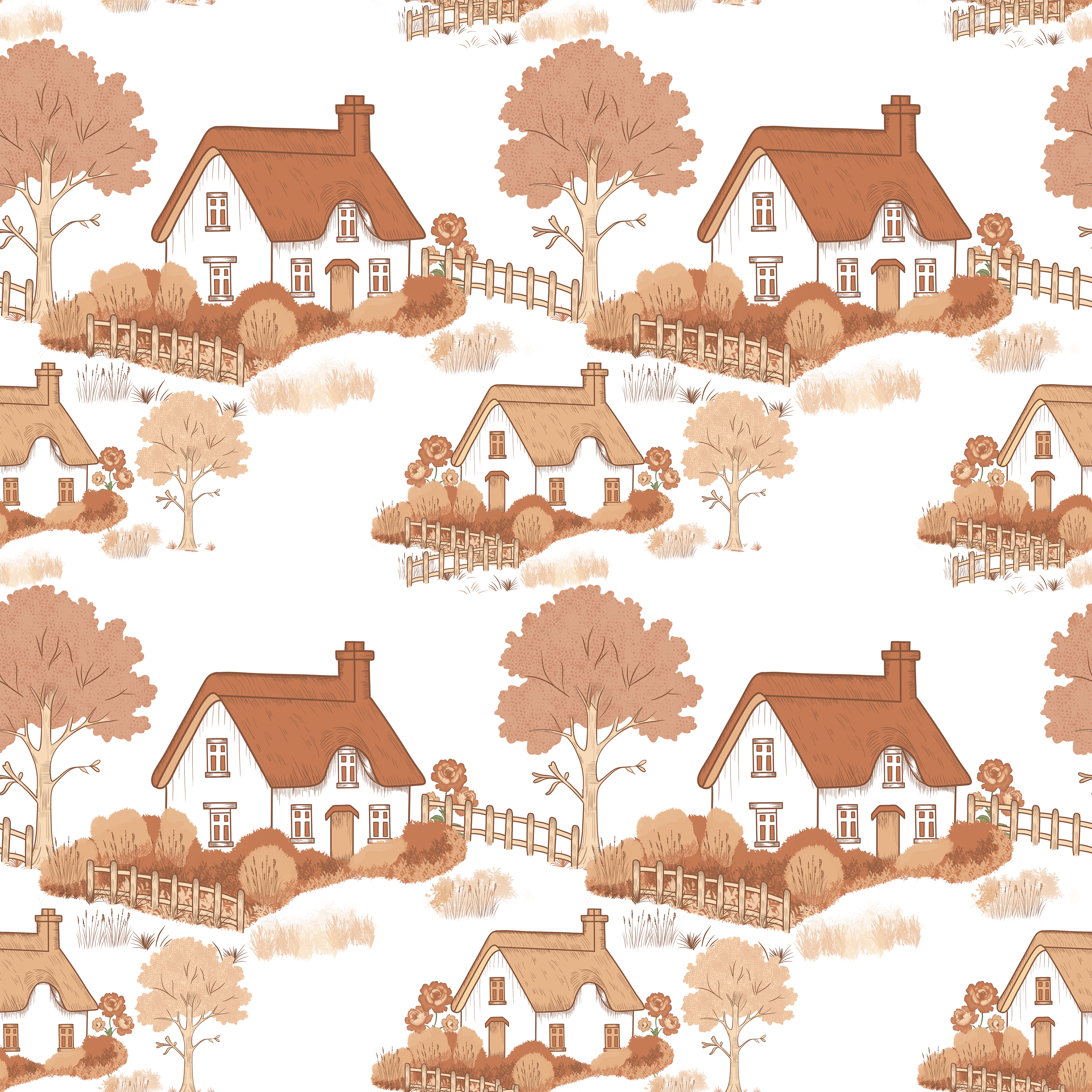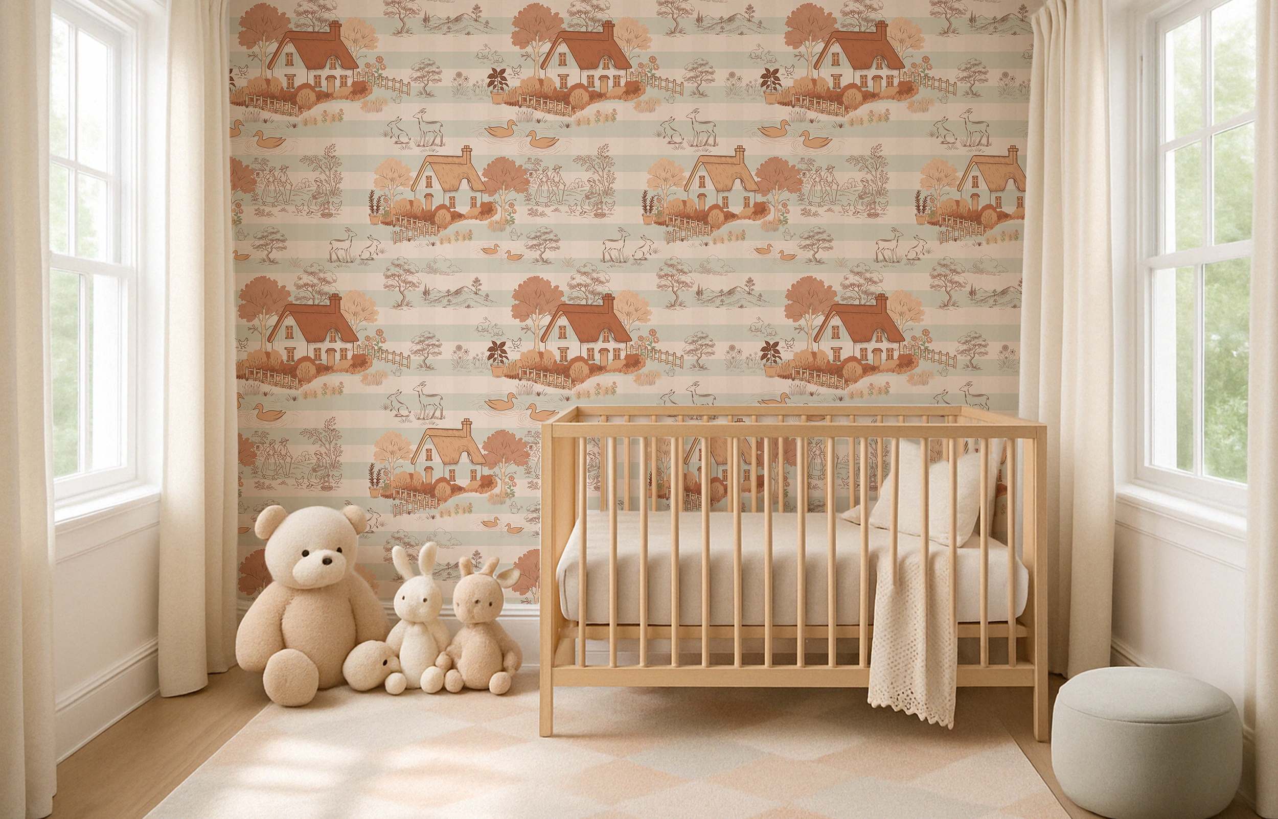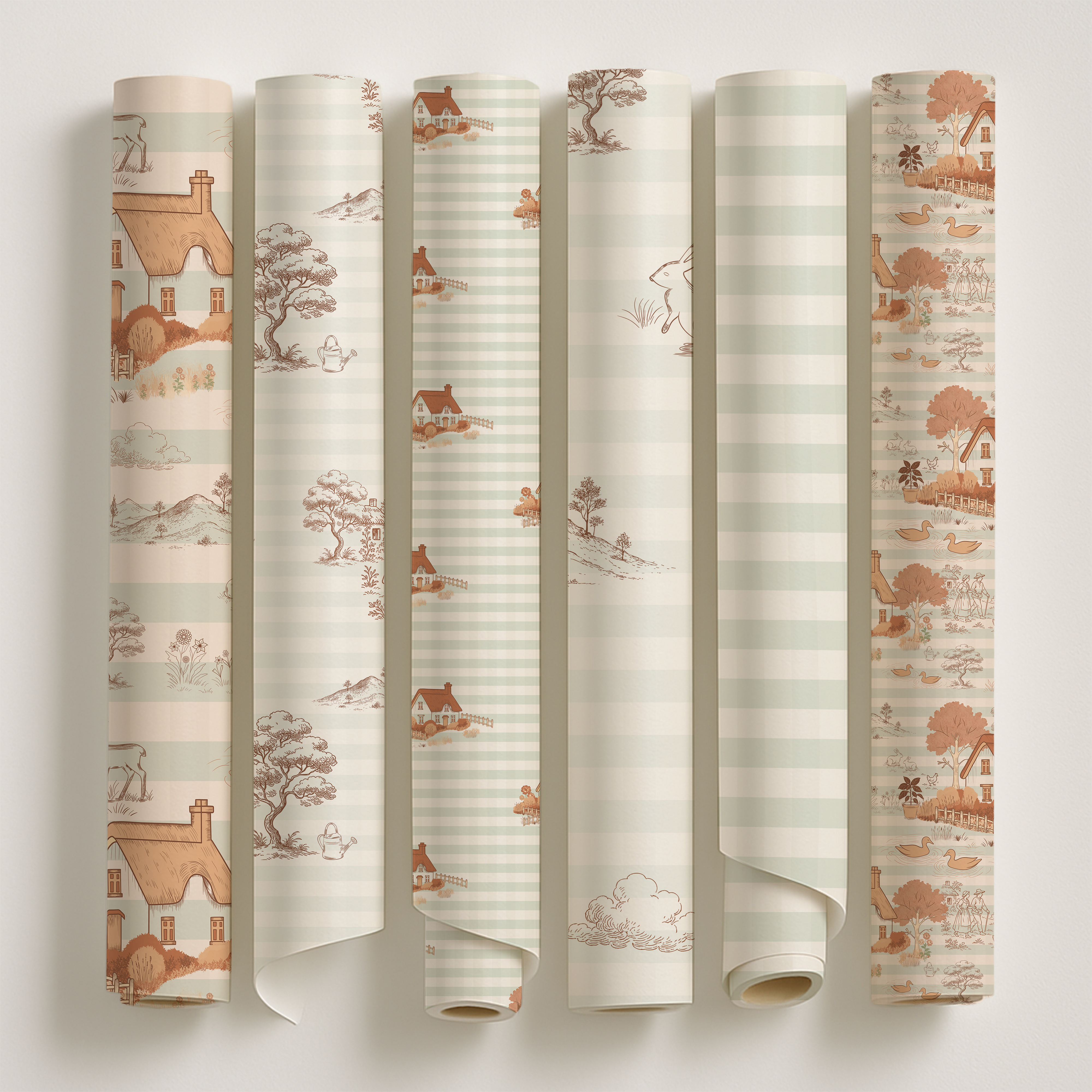 Whispers of the Countryside is a gentle ode to rural life, blending the cozy charm of cottagecore with classic toile-inspired storytelling. This collection paints a picture of peaceful villages, open fields, and quiet moments — where animals roam freely, gingham cloths flutter in the breeze, and time slows to a pastoral rhythm. Rendered in warm creams, soft sages, muted pinks, and earthy terracotta, the prints evoke comfort, nostalgia, and a return to simple beauty.