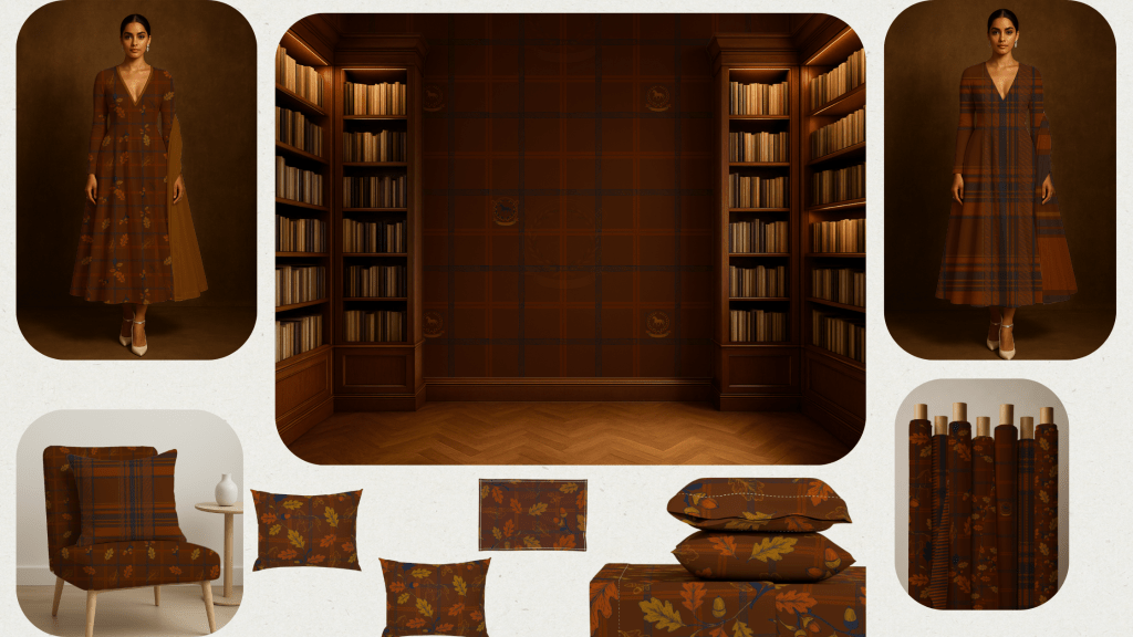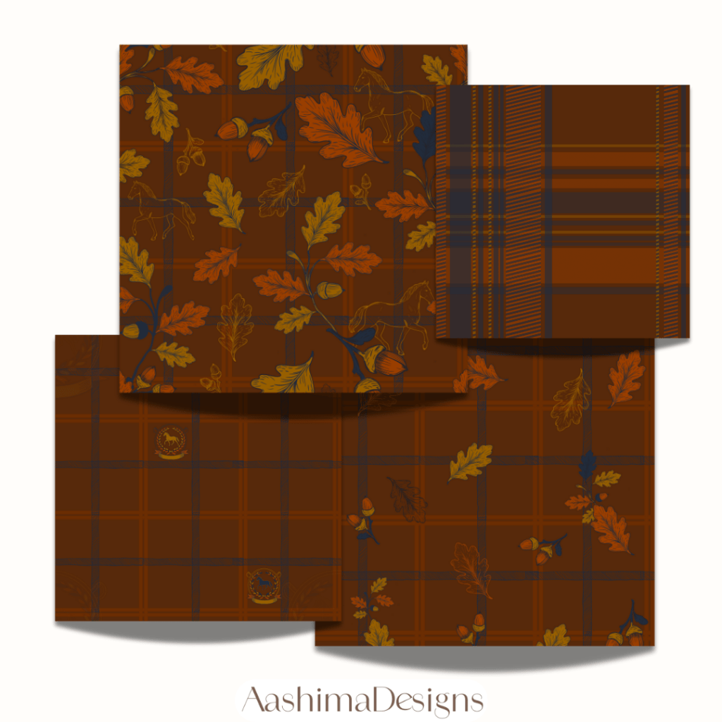 Highland Stables blends timeless equestrian elegance with the rich heritage of Scottish tartans. Inspired by the prestige of riding clubs and the grandeur of country estates, this collection features regal crests, laurel motifs, and traditional checks reimagined with a sophisticated palette. Designed for apparel, accessories, and luxury interiors, these patterns balance classic refinement with versatile
