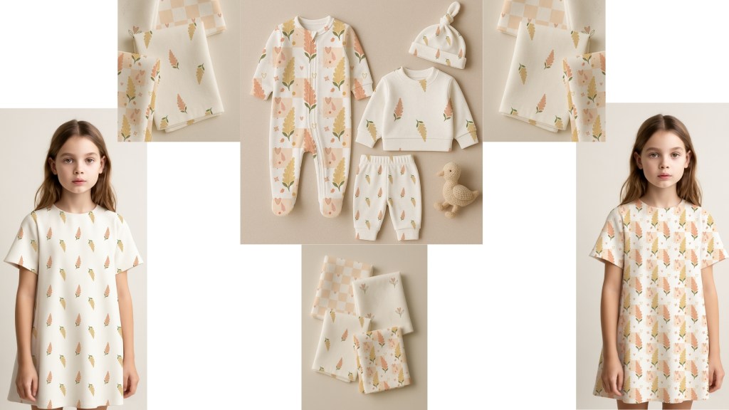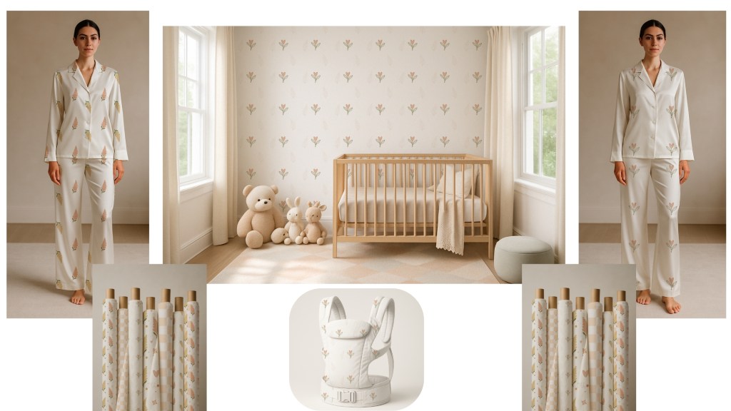 This babywear print collection captures the soft rhythm of early moments through floral motifs, playful hearts, tiny birds, and a dreamy diagonal palette- each pattern telling a peaceful, petal-filled story.