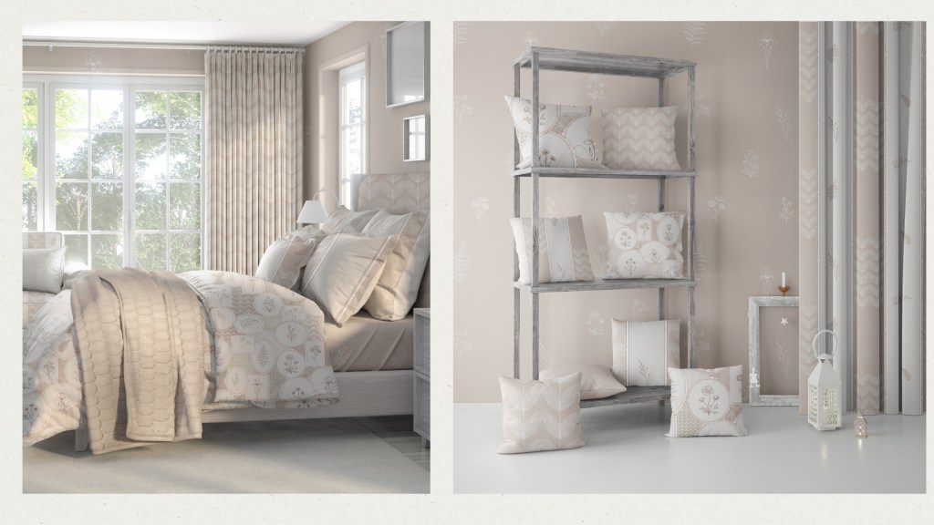 Designed for wallpaper, textiles, home décor, and interior applications, the collection features a carefully curated mix of hero patterns and coordinating designs, including framed floral compositions, panelled botanicals, rhythmic leaf repeats, delicate wildflower scatters, and a grounding solid neutral.