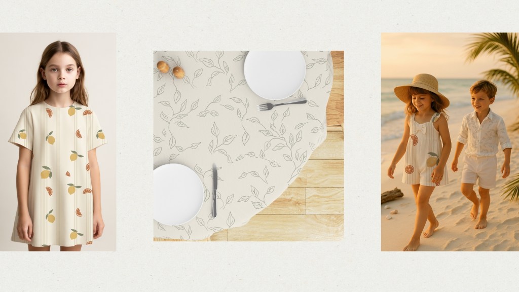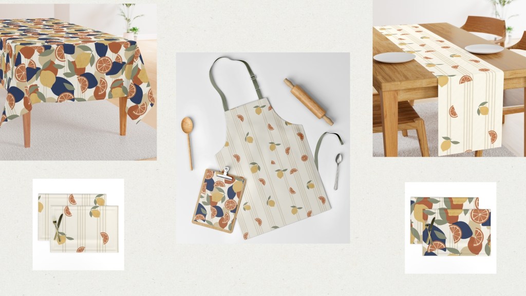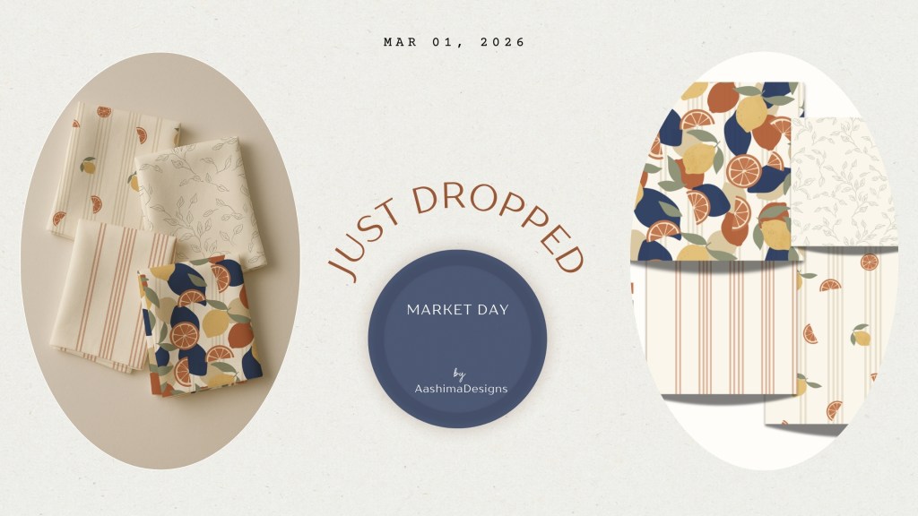 Market Day is a cheerful surface pattern collection inspired by the charm of open-air farmer’s markets and freshly gathered produce. Hand-illustrated citrus motifs, airy leaf sketches, and classic vertical stripes come together to capture the joy of seasonal harvests and relaxed market strolls. The mix of bold statement prints and soft coordinating patterns makes this collection versatile for textiles, home décor, and lifestyle products.